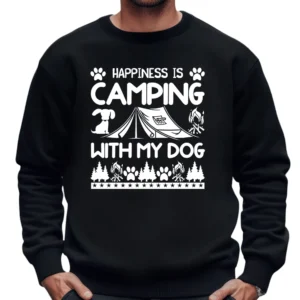 Gear up for your next camping trip with the Happiness Is Camping With My Dog Sweatshirt – Black: