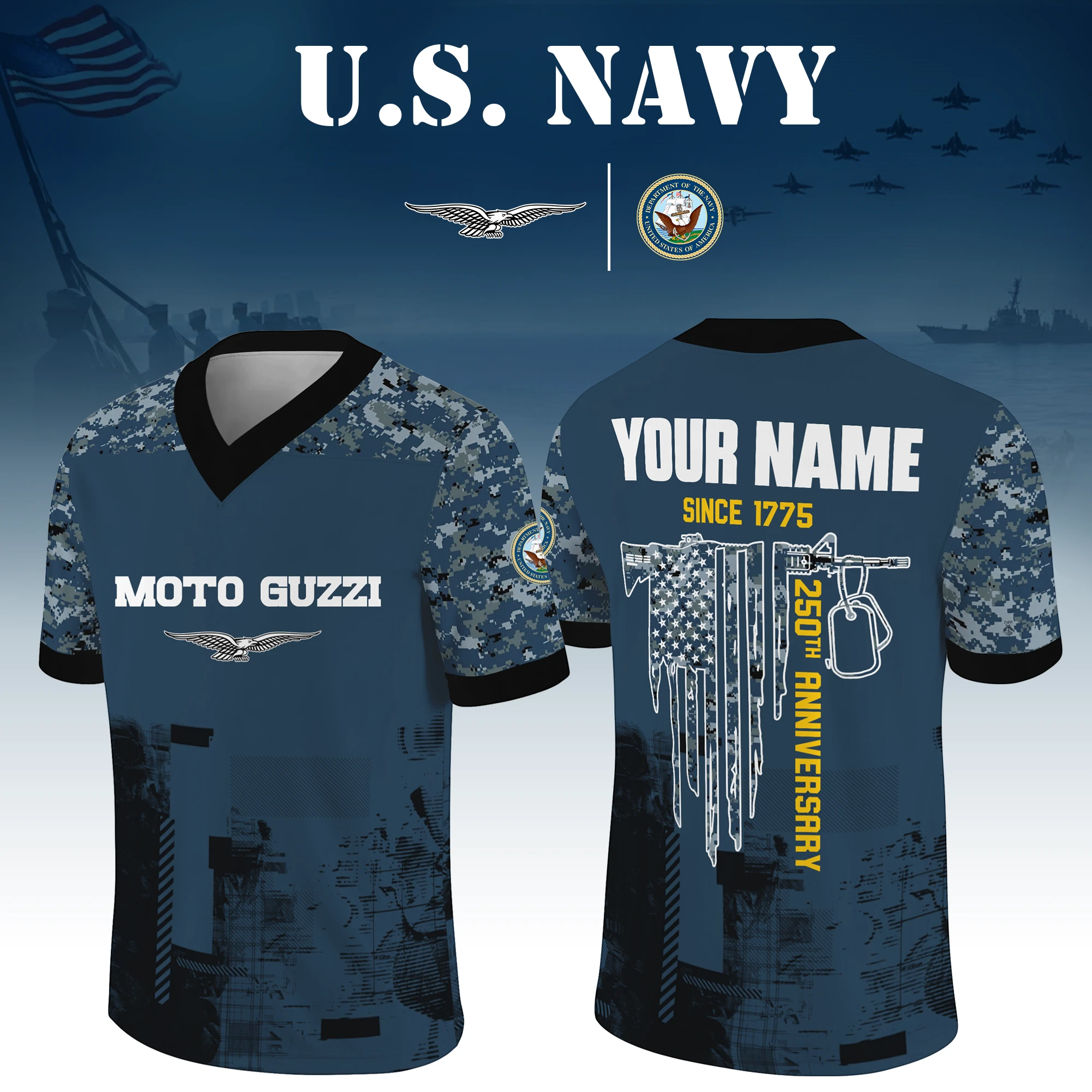 Moto Guzzi x US Navy 250th Anniversary V-Neck Short Sleeve Jersey 3D Limited 2026 Custom Your Name